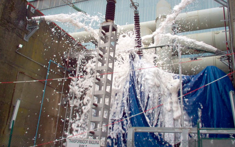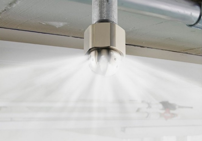 • Extinción por agua pulverizada o nebulizada: Este sistema funciona como el sistema de rociadores con la diferencia de que, en caso de incendio, descarga grandes cantidades de agua de forma optimizada, haciendo que se disperse el agua en gotas pequeñas, pero con la potencia suficiente para que penetren en el fuego, permitiendo así un eficaz enfriamiento de la zona del incendio y sus alrededores.